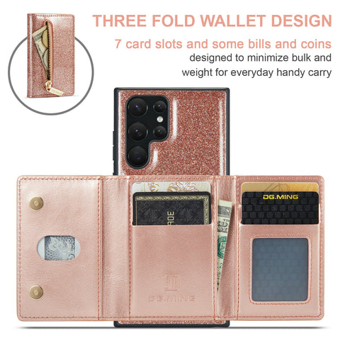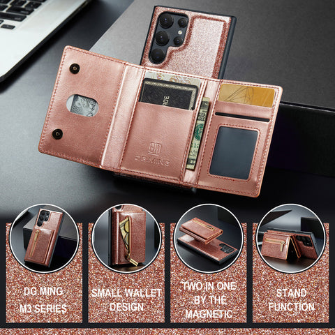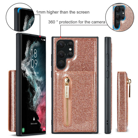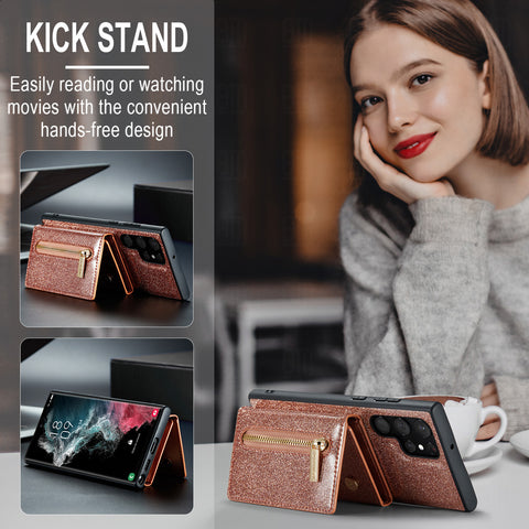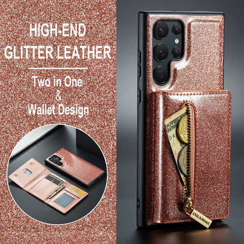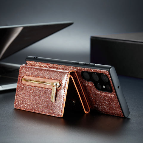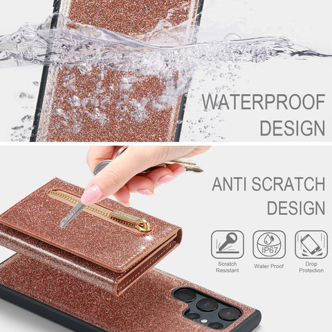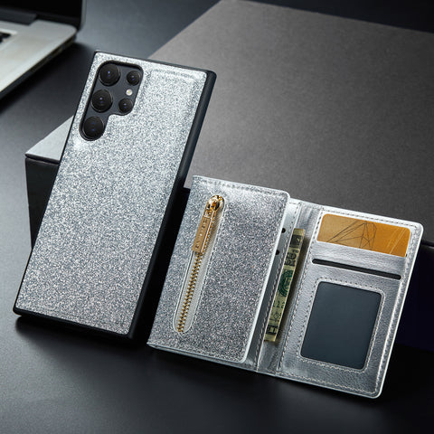 Introducing the Glitter Leather Magnetic Wallet Case - a powerful and practical case. With anti-fall and shockproof features, high-end glitter leather, and 360 protection for your camera and screen, this case is the ultimate solution for keeping your phone safe. Its two-in-one magnetic design allows for easy assembly and disassembly of the slim case and wallet, featuring seven card slots and space for bills and coins. The stand function allows for convenient hands-free use, while the waterproof and anti-scratch design ensures your phone stays safe and secure. Plus, the built-in magnets allow the case and wallet to be easily adsorbed on metal surfaces.