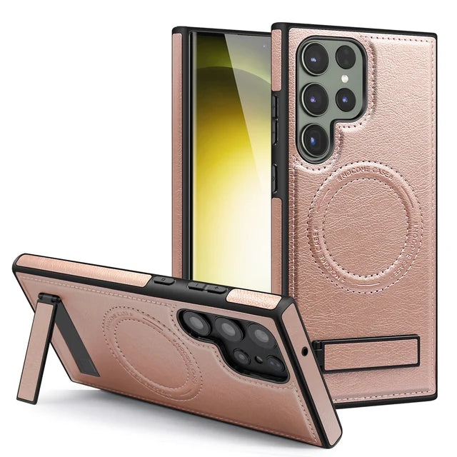 Leather Stand Magnetic Wireless Charging Phone Case with Fall Prevention Cover